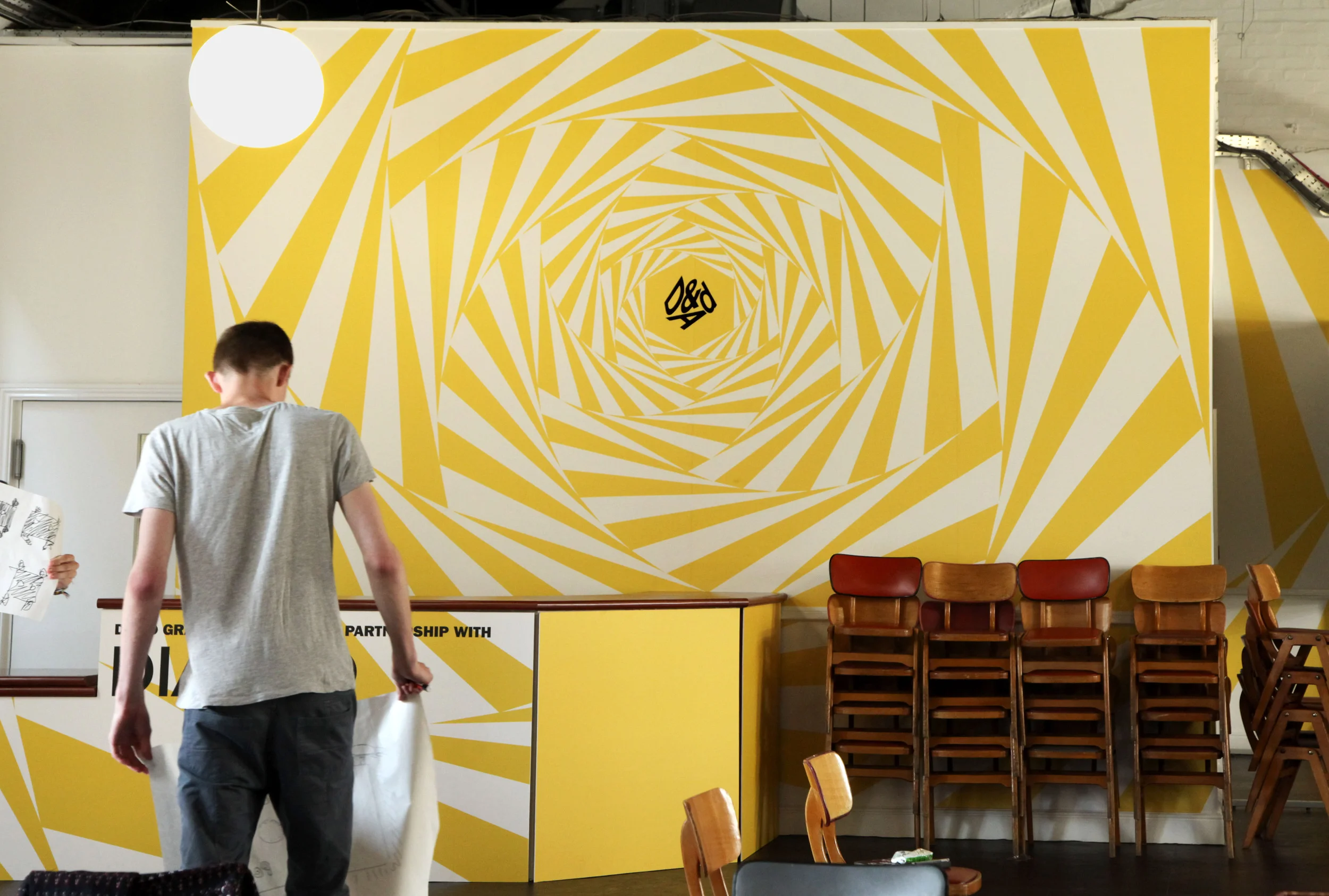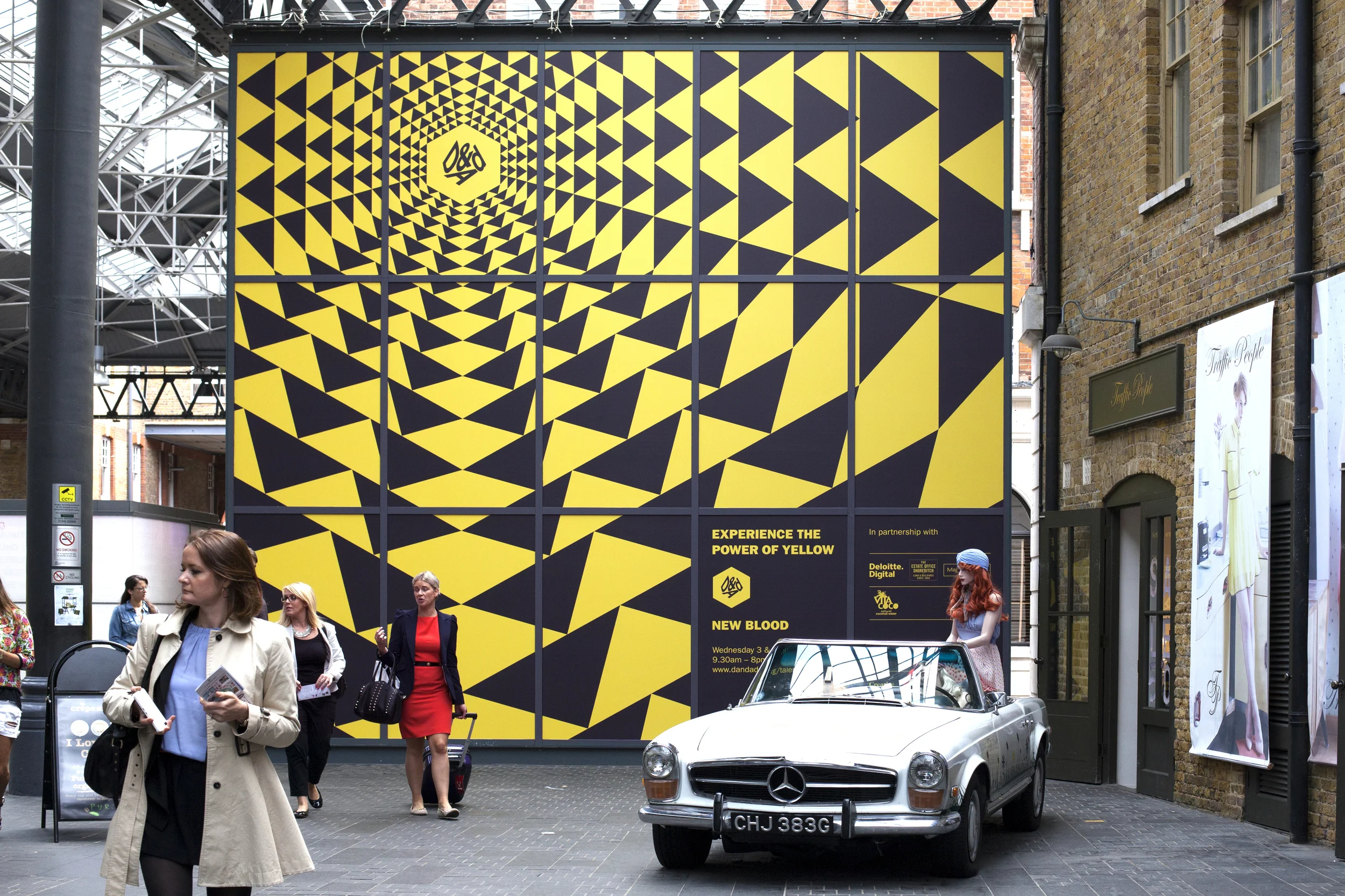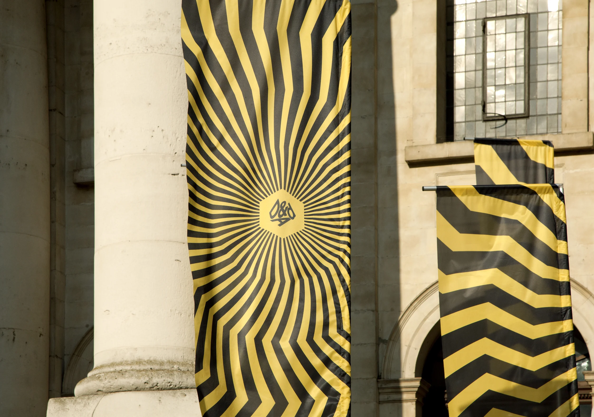The brand worked across a huge range of media from large scale printed graphics to dynamic screen interactions. Other applications we designed included flags, floor stickers, notice boards and sound reactive animation pieces.
